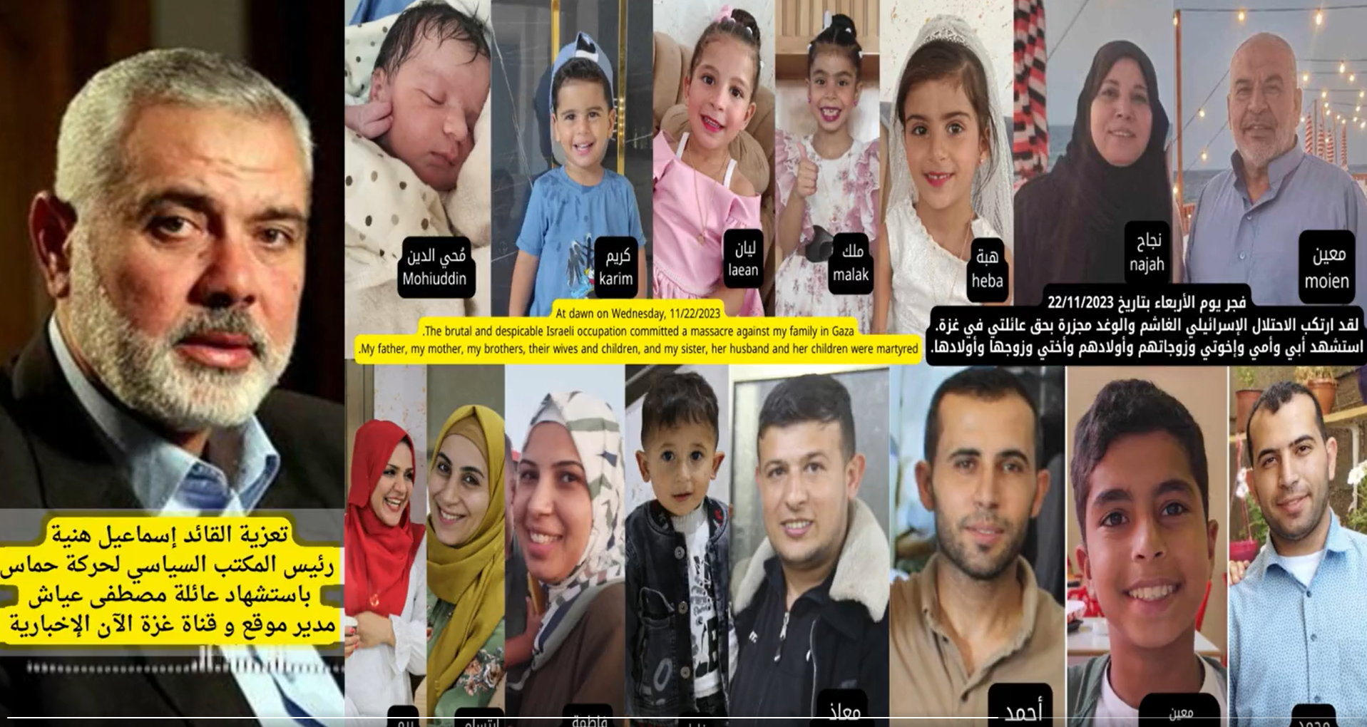 هنية يُعزي بإستشهاد عائلة مصطفى عياش مدير موقع و قناة غزة الان